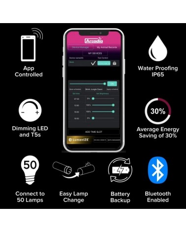 Die Arcadia LumenIZE lässt sich über eine App exakt an die Bedürfnisse deiner Tiere und Pflanzen anpassen. Ob Zeitsteuerung, Sonnenaufgang, Abenddämmerung, brennende Mittagssonne oder eine Reduktion der Lichtstärke für Schattenpflanzen